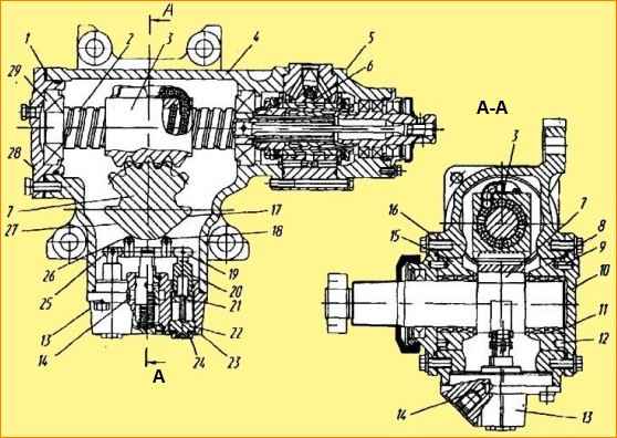 Mecanismo de dirección: 1 - cuñas; 2 - tornillo; 3 - estante para nueces; 4 - cuerpo; 5 - distribuidor; 6 - canal; 7 - sector; 8.15 - revestimientos excéntricos; 9 - pasador; 10,16, 28 - portada; 11, 29 - rodamientos; 12 - hoyo; 13 - válvula limitadora de presión; 14 - mandrinado de anillos; 17, 27 - cara lateral; 18, 26 - rodillo: 19, 25 - palanca; 20 - varilla; 21- nuez; 22 - enchufe; 23 - cuerpo; 24 - contratuerca