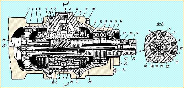 Distribuidor de dirección asistida: 1 - carcasa del mecanismo de dirección; 2,4,11,13 - cojinetes; 3 - nuez; 5- junta tórica; b- carcasa del distribuidor; 7 - válvula de retención; bola 8; 9 - tapa del distribuidor; 10.23 - pernos; 12 - casquillo; 14 - juntas de ajuste; 15 - puño; 16 - anillo de retención; 17 - anillo; 18 - eje de entrada; 19 - pasador; 20 - barra de torsión; 21 - anillo de sellado; 22 - tapa del sello de aceite; 24 - junta de ajuste; 25 - émbolo; 26 - carrete; 27 - pasador; 28 - tornillo; A - canal para drenar el fluido de trabajo para drenar; 11 - canal para suministrar fluido de trabajo desde la bomba; K, F - canales para el suministro (descarga) del fluido de trabajo a las cavidades del cilindro de potencia; C, J, D - perforaciones anulares; M, N - perforaciones para conectar las cavidades de los cojinetes de empuje con un drenaje; n - brecha