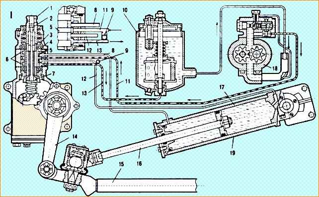 Esquema de funcionamiento de la dirección asistida al girar hacia la derecha: 1 - eje de entrada; 2 - barra de torsión; 3 - casquillo; 4 - rodamiento; 5 - carrete; 6 - émbolos; 7 - eje; 8,11,12,13 - líneas de aceite; 9 - válvula de retención; 10 - tanque; 14 - bípode de dirección; 15 - varilla longitudinal de dirección; 16 - varilla; 17 cilindros de potencia; 19 - bomba; 19 - pistón; p - espacio en la conexión estriada del eje 7 con el eje de entrada