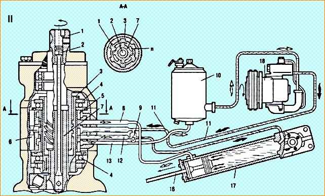 Diagrama de funcionamiento de la dirección asistida al girar a la izquierda: 1 - eje de entrada; 2 - barra de torsión; 3 - casquillo; 4 - rodamiento; 5 - carrete; 6 - émbolos; 7 - eje; 8,11,12,13 - líneas de aceite; 9 - válvula de retención; 10 - tanque; 14 - bípode de dirección; 15 - varilla longitudinal de dirección; 16 - varilla; 17 cilindros de potencia; 19 - bomba; 19 - pistón; p - espacio en la conexión estriada del eje 7 con el eje de entrada
