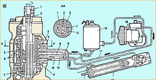 El mecanismo de dirección con un distribuidor incorporado y una válvula para limitar la presión del fluido de trabajo se muestra en la Fig. 2.