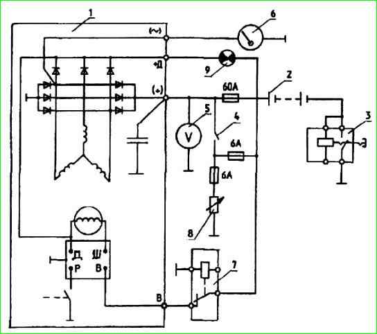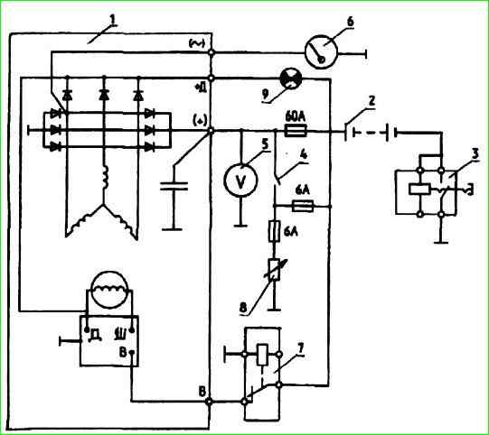 Esquema de conexión del grupo electrógeno 65.3701 a la red de a bordo del vehículo: 1 - grupo electrógeno; 2 - baterías; 3 - interruptor de tierra 4 - interruptor de arranque y de instrumentos; 5 - indicador de voltaje; 6 - tacómetro; 7 - relé de bloqueo del generador; 8 - carga; 9 - lámpara indicadora de carga de la batería