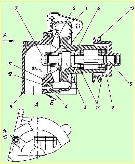 Bomba de agua: 1 - carcasa; 2 - impulsor; 3 - sello mecánico; 4 - casquillo; 5 - eje; 6 - liberación de agua; 7 - enchufe; 8 - tubería de suministro; 9 - anillo de retención; 10 - polea; 11, 12 - anillos de sellado; 13 - rodamientos; 14, 15 - tuercas de fijación y arandelas elásticas