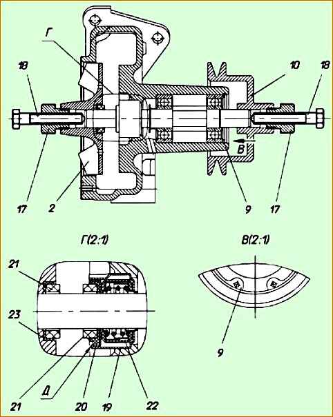 Desmontaje de la bomba de agua: 2 - impulsor; 9 - anillo de retención; 10 - polea; 17 - tuerca extractora; 18 - perno extractor; 19 - carcasa del sello mecánico; 20 - puño de la manga; 21 - manguito de sellado; 22 - manguito con conjunto de resorte