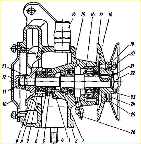 Bomba de agua: 1 - sello de aceite; 2 - carcasa de bomba; 3 - casquillo; 4 - perno para sujetar el tubo de entrada; 5 - anillo de retención del sello de aceite: 6 - anillo de empuje del sello de aceite; 7 - resorte del sello de aceite; 8 - manguito del sello de aceite; 9 - impulsor; 10 - tapa; 11 - rodillo; 12 - nuez; 13 arandela de seguridad; 14 - boquilla de derivación del tubo del termostato de agua; 15,16 - rodamientos de bolas; 17 - juntas; 18 - cuerpo del sello de aceite; 19 - casquillo del sello de aceite; 20 - tuerca para sujetar la pared lateral de la polea; 21 - arandela de seguridad; 22 - nuez; 23 - cubo de polea; 24 - pared lateral de la polea; 25 - cuñas de ajuste; 26 - engrasador