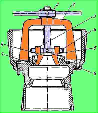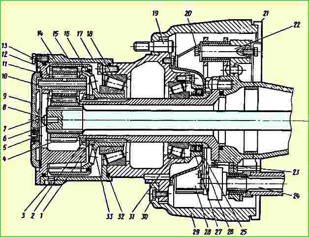 - - use una llave especial para desenroscar la contratuerca 2 de los cojinetes del cubo del engranaje conducido 16, retire la arandela de seguridad 1, desenrosque la tuerca del cojinete 33 y retire el cubo 16 junto con el engranaje conducido 15 y la pista interior de el rodamiento 18;