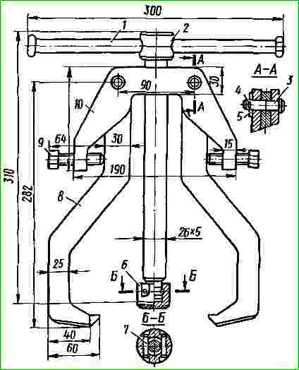 El dispositivo para instalar el semieje del eje motriz se muestra en la Fig. 4.