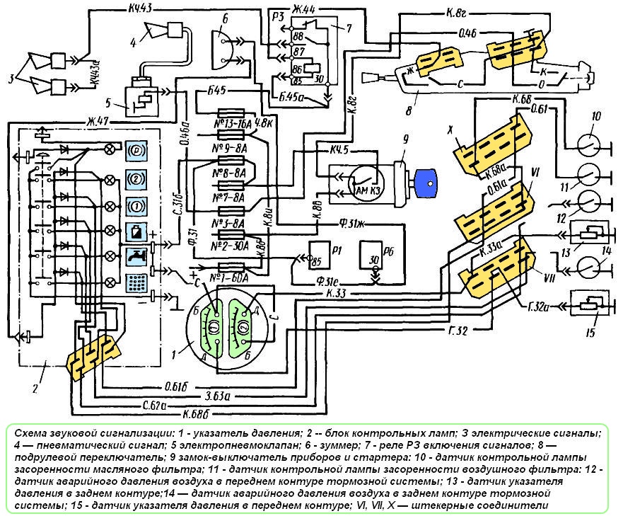 También se instala un relé-zumbador de ruido, que señala una disminución de la presión de aire en los circuitos del sistema de frenos y la obstrucción de los filtros de aire y aceite del motor, que está determinada por un cambio de presión cuando los filtros están obstruidos. .