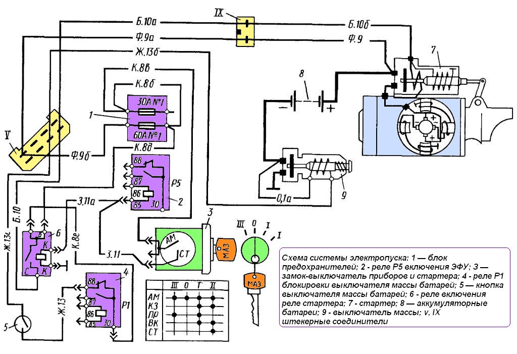 Cuando la llave del interruptor-cerradura de los instrumentos y el arrancador se gira a la posición II (ver Fig. 1), los contactos de los terminales "AM" y "CT" de la cerradura se cierran y se suministra tensión al relé intermedio 6 para arrancar el motor de arranque.