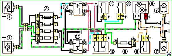 Esquema de encendido de faros y luces antiniebla: 1 - faros; 2 - bloque de fusibles principal; 3 - relé para encender las luces de cruce; 4 - interruptor de encendido; 5 - interruptor de iluminación exterior; 6 - luces de control de luces altas (izquierda) y luces antiniebla (derecha); 7 - luces antiniebla en las luces traseras; 8 - interruptor de luces antiniebla; 9 - bloque de fusibles adicional; 10 - interruptor de faros; 11 - relé para luces de carretera