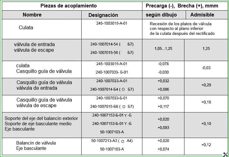 El rebaje de los planos inferiores de las placas de las válvulas de admisión y escape con respecto al plano inferior de la culata debe estar entre 1,05 y 1,25 mm.