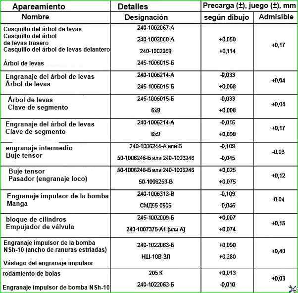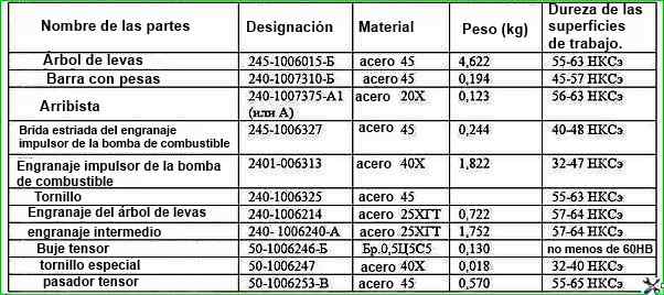 Requisitos para piezas del mecanismo de distribución de gas ZIL-5301