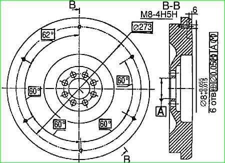 Кожух с нажимным диском в сборе балансируется путем установки на фланец кожуха специальных балансировочных грузиков или высверливания на диаметре 273 мм во фланце кожуха отверстий диаметром 9 мм.