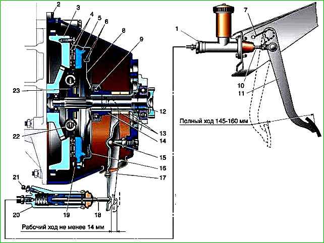 Для временного отсоединения двигателя от трансмиссии служит привод выключения сцепления.