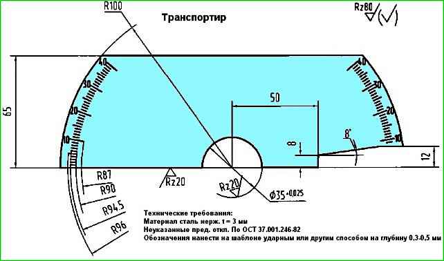 При этом стрелка шаблона должна располагаться на метке транспортира 20˚30′± 2˚40′