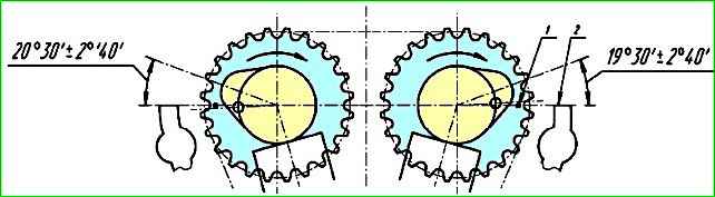 После установки звездочки поворотом распределительного вала против часовой стрелки натянуть ведущую ветвь цепи, при этом стрелка шаблона, установленного на кулачок, должна показывать 19°30’±2°40’.
