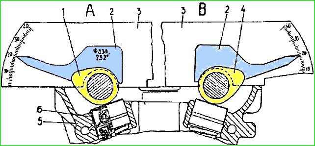 В качестве примера рассмотрим корректировку фаз газораспределения при показаниях стрелки шаблона 23°30′ для кулачка впускного клапана и 16°30′ для кулачка выпускного клапана, данные значения углов превышают номинальные значения для впускного и выпускного кулачков на 3°, что больше допустимого отклонения ±2°40’.