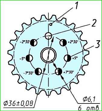При этом три дополнительных отверстия, смещенные от оси симметрии впадины зубьев по часовой стрелке, плюсовые, три других, смещенные против часовой стрелки, - минусовые, если смотреть на звездочку со стороны метки 1.