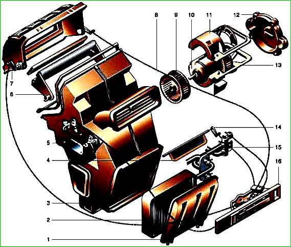 Отопитель состоит из пластмассового кожуха, в котором установлены радиатор, два вентилятора, закрепленные на валу электродвигателя, верхней, центральной и нижней заслонок и панели управления с тремя рычагами и выключателями.