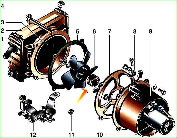 На левой стороне отопителя установлен добавочный резистор, обеспечивающий пониженные скорости вращения электровентилятора. К радиатору отопителя подходят подводящий и отводящий резиновые шланги.