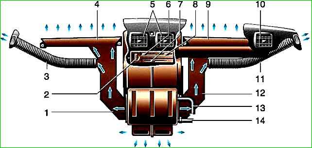 Далее воздух проходит через короб воздухозаборника, сам отопитель и (в зависимости от расположения заслонок) поступает на обдув ветрового стекла, стекол дверей, а также в зону ног водителя и пассажиров.