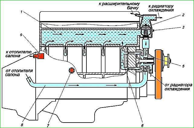 Насос подает жидкость в рубашку охлаждения 6 блока цилиндров, откуда жидкость поступает в рубашку 1 головки цилиндров и далее в корпус термостата 2.