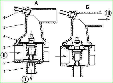 На холодном двигателе основной клапан 4 термостата закрыт, и вся охлаждающая жидкость циркулирует через открытый перепускной клапан 2 термостата в водяной насос по малому кругу, минуя радиатор.