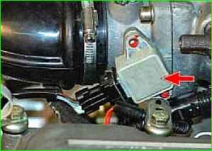 Датчик детонации расположен в верхней части блока цилиндров двигателя с правой стороны и закреплен гайкой с пружинной шайбой.