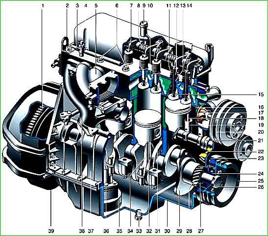 Двигатель: 1 - маховик; 2 - монтажная проушина; 3 - кран отопителя: 4 - крышка головки блока цилиндров; 5 - впускной трубопровод; 6 - гайки шпилек крепления головки блока цилиндров; 7 - коромысло клапана; 8 - ось коромысел; 9 - патрубок вентиляции картера; 10 - головка блока цилиндров; 11 - пружины клапана; 12 - маслоотражательный колпачок; 13 - втулка клапана; 14 - крышка маслоналивной горловины; 15 - клапан; 16 - прокладка головки блока цилиндров; 17 - насос охлаждающей жидкости; 18 - штанга; 19 – толкатель; 20 - шкив вентилятора; 21 - распределительный вал; 22 - ведомая шестерня привода распределительного вала; 23 - демпфер крутильных колебаний; 24 - ступица шкива; 25 - шкив; 26 - болт шкива; 27- манжета; 28 - ведущая шестерня привода распределительного вала; 29 - коленчатый вал; 30 - поддон картера; 31 - гильза цилиндра; 32 - поршень: 33 - пробка маслосливного отверстия; 34 - шатун; 35 - маслозаборник; 36 - масляный насос; 37 - блок цилиндров: 38 - выпускной коллектор; 39 - картер