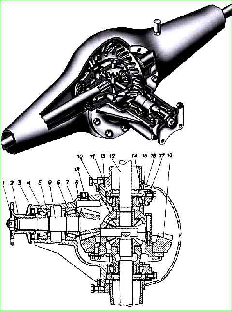 Главная передача и дифференциал заднего моста устанавливаются в картер 8 редуктора, который закрепляется болтами в отверстиях балки моста.