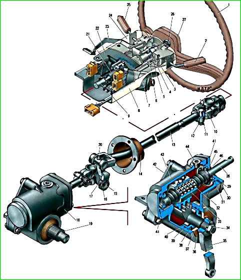 Рулевой механизм и рулевая колонка: 1 - рулевое колесо; 2, 25 - подрулевые переключатели; 3 - стопорное кольцо; 4 - шайба; 5 - подшипник; 6 - пластмассовая втулка подшипника; 7 - выключатель (замок) зажигания; 8 - нижняя часть кожуха рулевой колонки; 9 - вал рулевой колонки; 10 - карданный шарнир; 11 - клин; 12 - гайка; 13 - промежуточный вал рулевого управления; 14 - уплотнитель промежуточного вала; 15 - подшипник карданного шарнира; 16 - иглы подшипника; 17 - стопорное кольцо; 18 - механизм рулевого управления; 19 - вал сошки; 20 - пресс-масленка карданного шарнира; 21 - труба рулевой колонки; 22 - кронштейн; 23 - рукоятка механизма фиксации рулевой колонки; 24 - верхняя часть кожуха рулевой колонки; 26 - гайка крепления рулевого колеса; 27 - декоративная накладка рулевого колеса; 28 - винт шариковой гайки; 29 - верхняя крышка; 30 - регулировочная прокладка; 31, 39 - уплотнительные кольца; 32 - шарик шариковой гайки; 33 - шариковая гайка; 34 - гайка; 35 - сошка; 36 - крышка; 37 - поролоновое кольцо; 38 - стопорное кольцо; 40 - подшипник вала сошки; 41 - подшипник винта шариковой гайки; 42 - кронштейн; 43 - картер; 44 - пробка наливного отверстия; 45 - сальник; 46 - защитная крышка