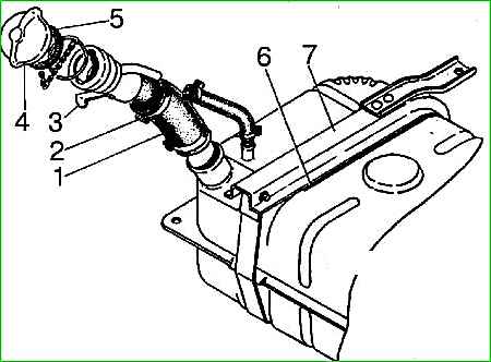Для этого необходимо ослабить гайки крепления пластины петли лючка наливной трубы и вынуть кронштейн 3, снять лючок пола кузова (над топливным баком) и отсоединить топливные шланги от топливозаборника, снять провода, идущие к датчику указателя уровня топлива и изолировать их, отсоединить от кронштейнов стяжные ленты (предварительно поставив под бак упоры) и снять бак.