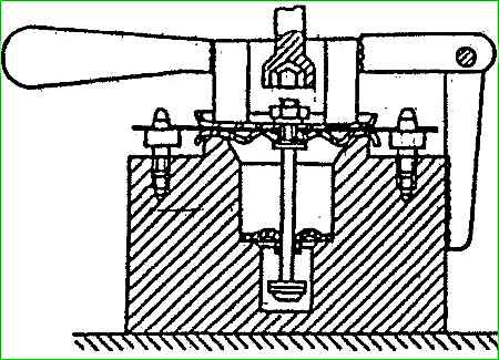 Затем вставить тягу в приспособление и последовательно надеть на выступающий конец тяги резиновый уплотнитель тяги, уплотнительную медную шайбу, нижнюю чашку (вогнутой стороной вниз), четыре лепестка диафрагмы (так, чтобы штифты приспособления вошли в ее отверстие), верхнюю чашку и завернуть гайку рукой на несколько ниток резьбы, поставив под нее пружинную шайбу.