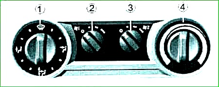 Для быстрого удаления запотевания и обмерзания стекол установите ручку 1 в положение направления потока воздуха на ветровое и боковые стекла, ручку 4 — в крайнее правое положение (широкая часть красного символа), а ручку 2 в крайнее правое (по часовой стрелке) положение максимальной скорости вращения электровентилятора ОВУ.