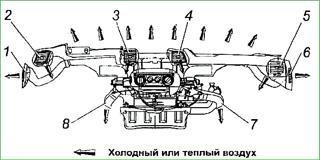ОВУ подсоединена к каналам распределения воздуха, выполненным в панели приборов через воздуховоды 6 и 7