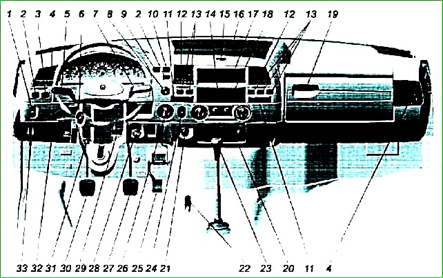 3 — заглушка (для ГАЗ-2705) или ручка регулятора интенсивности прогрева воздуха в кабине ГАЗ-2705 «Комби» или в салоне автобусов 4 — ручка регулятора температуры воздуха в кабине (ручка одновременно управляет краном отопителя и заслонками подмешивания).