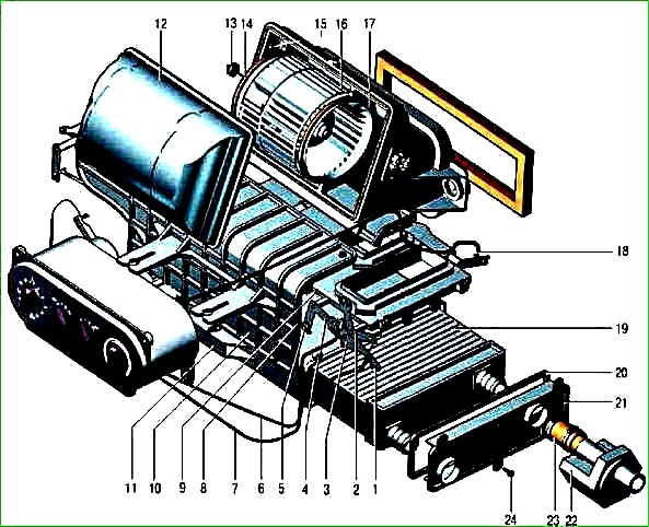 Детали основного отопителя автомобилей выпуска с 2003 года: 1 - скоба; 2,4 - рычаги оси заслонок; 3 - кронштейн крепления оболочек тяг привода; 5 - фиксатор; 6, 7,18 - оболочки тяг привода; 8,9 - рейки привода заслонок; 10 - защитный кожух; 11 - корпус отопителя; 12 - крышка вентилятора; 13 - уплотнитель провода; 1 4 - провод; 15 - винт крепления крышки вентилятора; 16 - вентилятор отопителя; 17 - уплотнитель крыльчатки вентилятора; 19 - радиатор отопителя; 20 - прокладка крышки радиатора; 21 - крышка радиатора; 22 - кран отопителя; 23 - соединительный шланг; 24 - винт крепления крышки