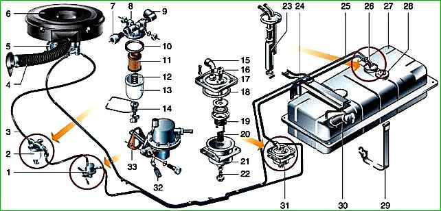 Система питания состоит из топливного бака, топливопроводов, топливного насоса, фильтра-отстойника, фильтра тонкой очистки топлива, карбюратора с приводом дроссельных и воздушной заслонок, воздушного фильтра