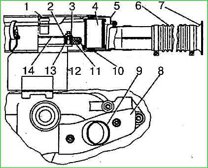 Тяга диафрагмы уплотняется резиновым уплотнителем 2.