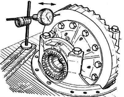 Если при проверке окажется, что биение превышает указанную величину, то можно предполагать, что имеет место деформация ведомой шестерни, повреждение коробок дифференциала или чрезмерный износ подшипников.