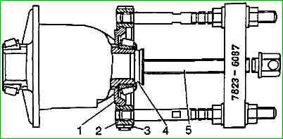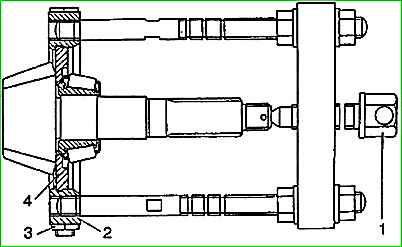 - - снять внутреннее кольцо заднего подшипника ведущей шестерни съемником, как показано на для того, чтобы заплечики вкладыша 4 плотно входили между обоймой подшипника и шестерней, следует опоры 2 сжать болтами с гайками 3.
