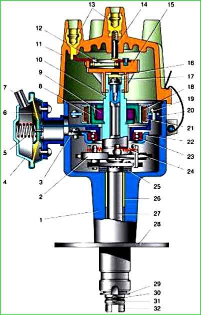 Датчик-распределитель выполняет две функции: задает момент искрообразования и распределяет импульсы высокого напряжения по цилиндрам в соответствии с порядком их работы.