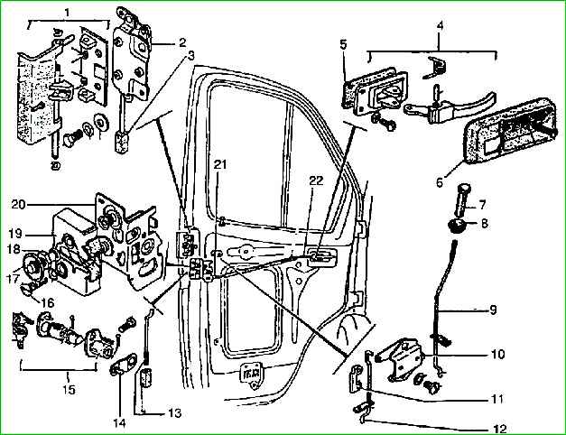 Замки боковой и правой двери задка, их наружный и внутренний привод, система блокировки по конструкции аналогичны системам замка передней двери конструкции до февраля 2000 г.