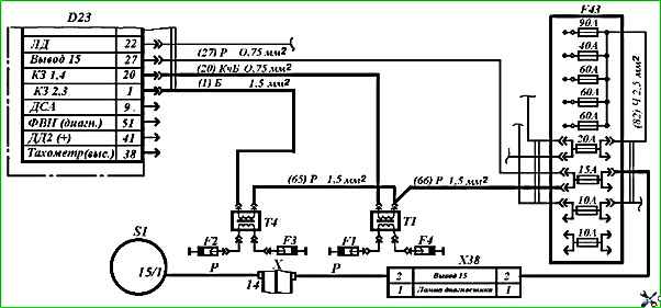 Включить принудительно главное реле, замкнув контакты 3 и 19 и, включив зажигание, проверить наличие напряжения 12В на выводах 27, 37, 18, 20 и 1 колодки.