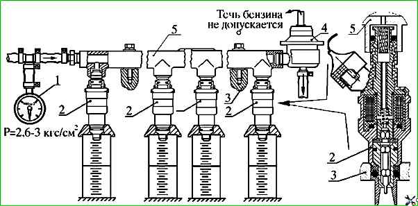 - При необходимости снять топливораспределитель 5 с форсунками 2 и регулятором давления 4 с двигателя и проверить идентичность расходных характеристик форсунок 2 и герметичность регулятора давления 4 на специальном стенде 3 при давлении бензина 3,0 кг/см 2 и температуре от 15˚ до 20˚С.