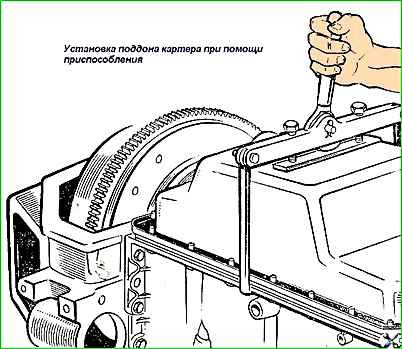 - - установить подсобранный поддон на шпильки, прижать с помощью приспособления (рис. 14) к блоку и закрепить гайками с шайбами;