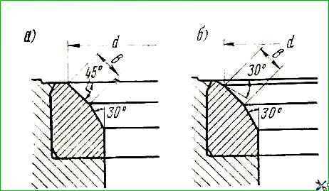 Ширина фаски обеспечивается расшлифовкой отверстия седла под углом 30°, как показано на рис. 18, а.