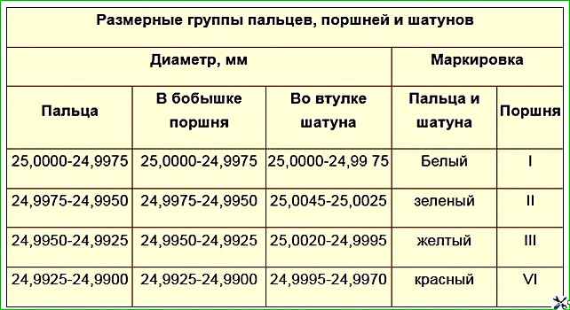 Цвет маркировки пальца должен соответствовать цвету маркировки на бобышках поршня;