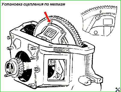 Метки «О», выбитые на кожухе нажимного диска и маховика около одного из отверстий для болтов крепления кожуха (рис. 4), должны быть совмещены.