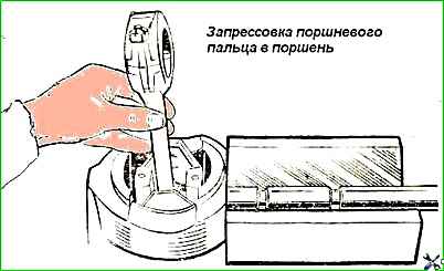- подобрать поршневой палец к шатуну так, чтобы при нормальной комнатной температуре он плавно перемещался в отверстии верхней головки под легким усилием большого пальца руки.